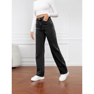 Straight Wide Leg Women's Jeans Elastic Comfort Waist Large Pockets Design